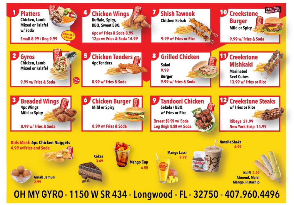 Oh My Gyro is a Halal fast food restaurant located in Longwood, FL, offering a variety of delicious options in a casual setting. The menu includes gyro platters with yellow rice, protein, salad, and pita bread, as well as gyro sandwiches with fries. The lamb gyro and chicken gyro are fan favorites, with customers praising the freshness and flavor of the dishes. The restaurant also serves breaded wings combos and falafel gyros for those looking for a vegetarian option. While some customers have noted minor issues with sauciness and undercooked fries, overall, the food quality and taste are highly praised. With a range of vegan options, gender-neutral restrooms, and outdoor seating, Oh My Gyro caters to a diverse clientele. Don't miss out on this hidden gem for a satisfying fast food experience.