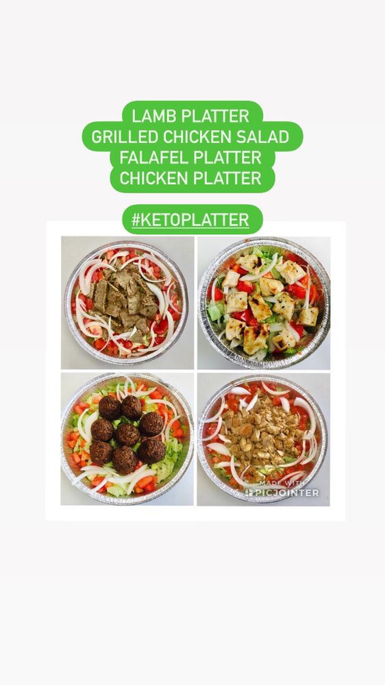 Our Platters include yellow rice, your choice of protein, salad (lettuce, tomatoes, onions) and pieces of pita bread.